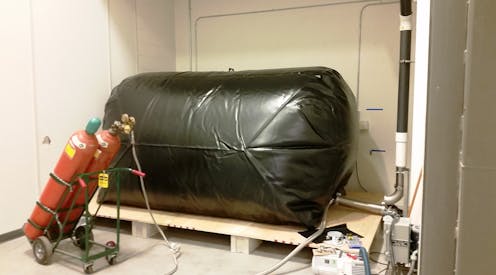 Second, there is a collection system. For large facilities, this consists of a large, flexible bag. The bag expands as it collects the evaporated helium, storing it temporarily. This bag is the size of a small car, and where space is a concern, smaller facilities can use helium tanks for storage.