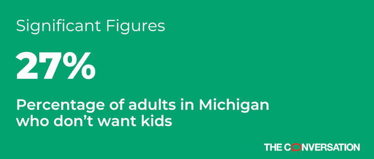 Our study suggests that the number of people who choose not to have children may be larger than previously thought. Although our study focused on Michigan residents, the state’s population is similar to the overall U.S. population in terms of age, race, income and education. So we’d expect to see similar numbers of child-free people in other states.