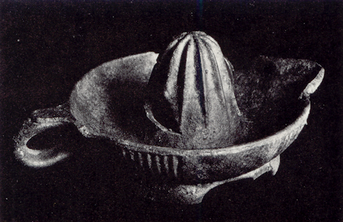 This insight compelled him to use a variety of ironic signals to disrupt the credibility of the museum narrative and test the viewer’s understanding whether Llhuros was real or invented. He might assemble a massive bronze temple door from plastic foam packing cartons, or create an oil lamp that resembles an orange juicer.
