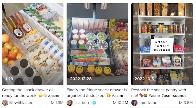 Influencers film themselves shopping for supplies, prepping food, refilling containers, and organizing their pantries – often coupled with hashtags like #pantryrestock, #pantryASMR, and #pantrygoals. They transfer dry goods from the store-bought bags into matching glassware; they stock the home coffee bar with coffee pods and flavored syrups; they refill stackable bins with single-serving snacks; they create multiple types of ice cubes – each with its own dedicated freezer section. Much of this pantry porn is performed against a backdrop of rhythmic ASMR-inspired clinks, glugs, snaps, rips and thunks that appeal to viewers’ pleasure centers.