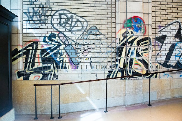 Informal history was preserved as well, including a section of graffiti and blemishes carved into the original marble floors by the thousands of shoes that had traversed the station.