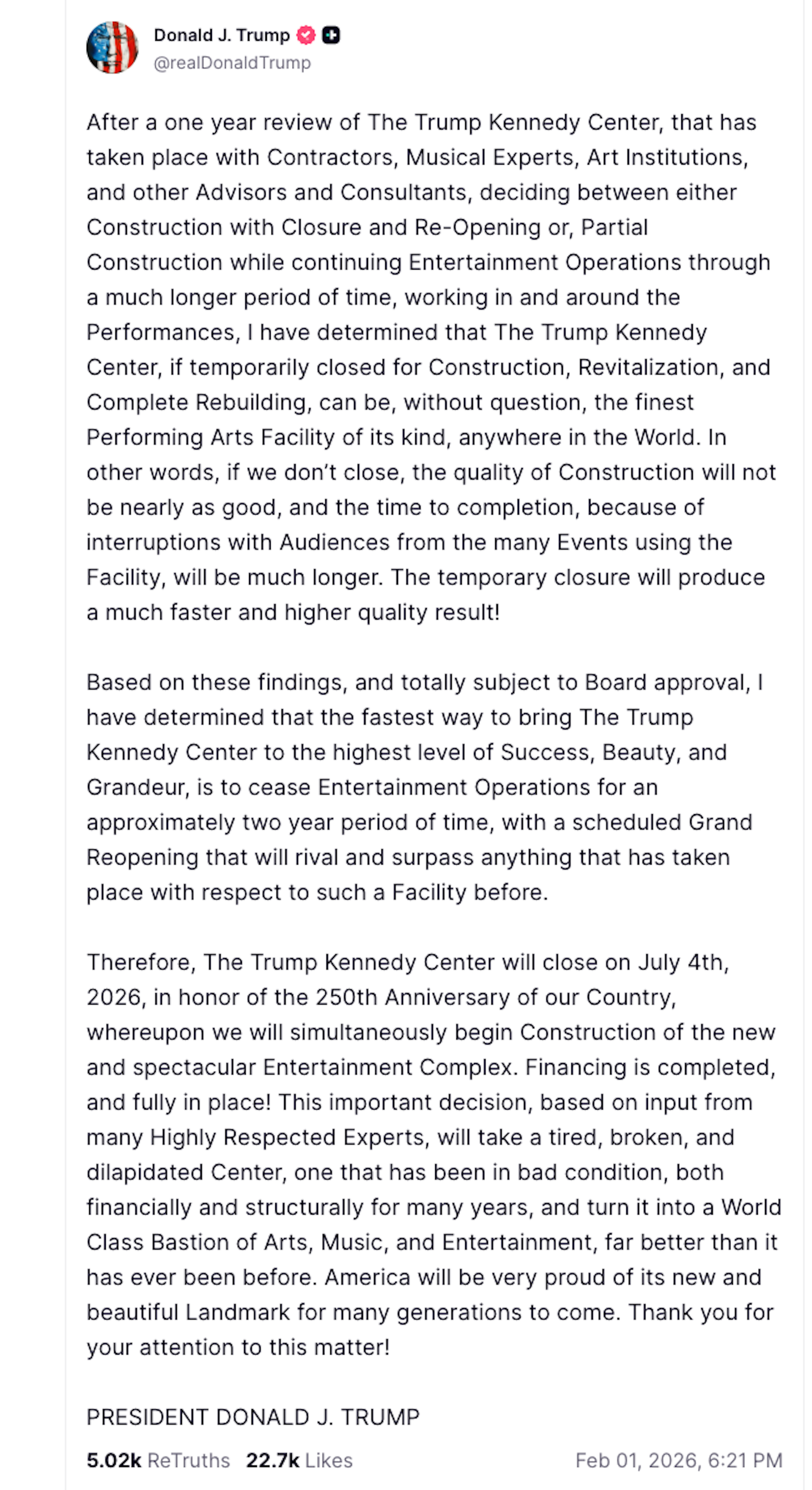 It’s anyone’s guess whether Trump’s Truth Social post about closing the center will prove true or merely provocative. The board, the center’s leaders, its staff and the people scheduled to perform there after July 4 appeared to be surprised by the announcement.