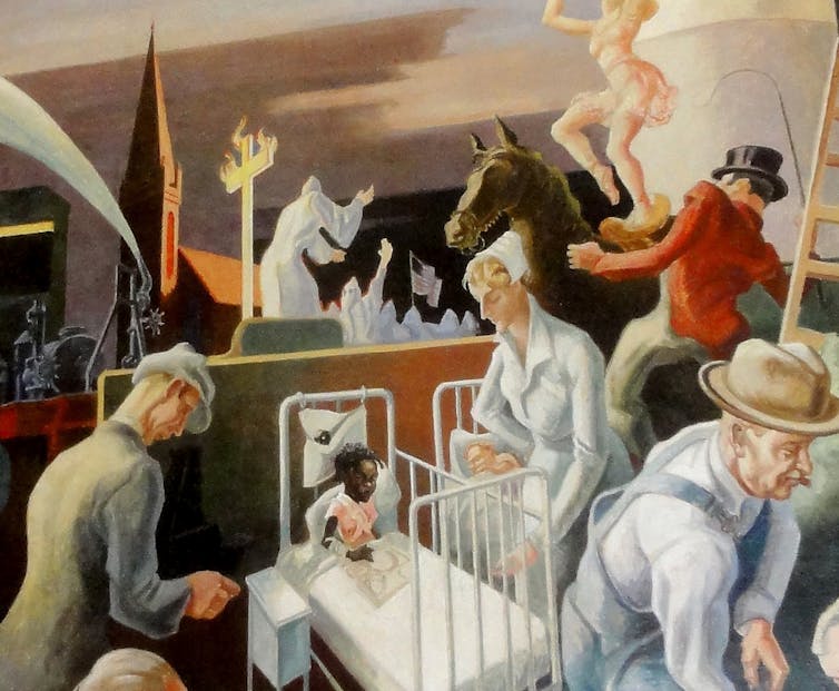 In the controversial panel, Benton painted a reporter, a photographer and a printer into the foreground – an homage to the press of Indiana for breaking the power of the Klan. In the center, a white nurse tends both black and white children in City Hospital (now Wishard Hospital).