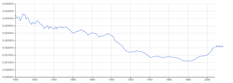 Recently, however, attitudes toward shaming have shifted, even as the chorus of disapproval continues. According to a Google Ngram search, references to shame in written texts – in decline in the United States since the mid-19th century – have, in recent decades, increased far more than in other English-speaking countries.