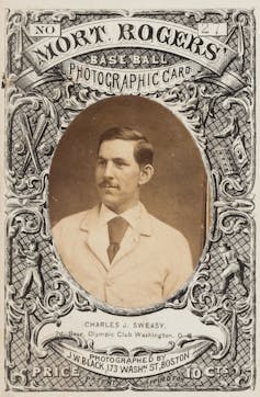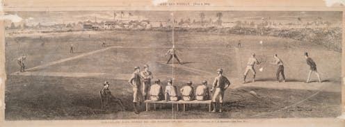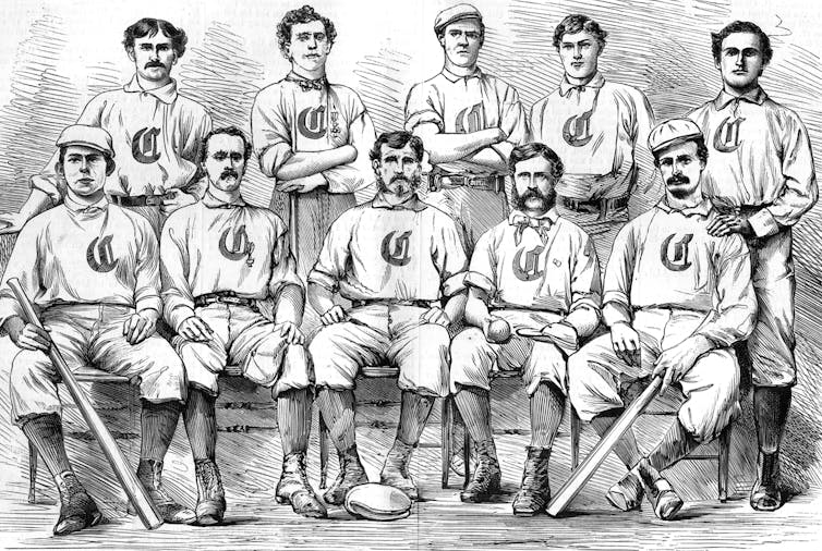 Cincinnati’s main club, the Red Stockings, was run by an ambitious young lawyer named Aaron Champion. Prior to the 1869 season, he budgeted US$10,000 for his payroll and hired Harry Wright to captain and manage the squad. Wright was lauded later in his career as a “baseball Edison” for his ability to find talent. But the best player on the team was his 22-year-old brother, George, who played shortstop. George Wright would end up finishing the 1869 season with a .633 batting average and 49 home runs.