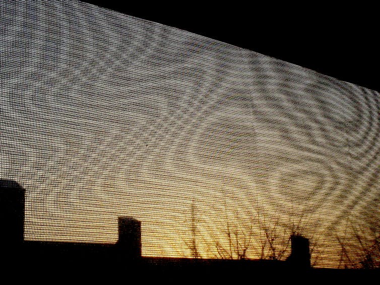 Placing an insect screen and a net curtain outside a window, for example, will generate moiré patterns that change as the wind varies. This works even on overcast days, but in direct sun the moiré patterns are also cast as moving shadows on interior surfaces.