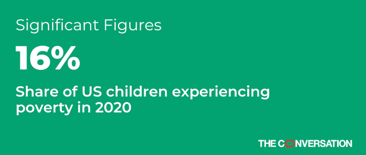 In 2020, about 1 in 6 kids, 16% of all children, were living in families with incomes below the official poverty line – an income threshold the government set that year at about US$26,500 for a family of four. Only 10% of Americans ages 18 to 64 and 9% of those 65 and up were experiencing poverty, according to the most recent data available.