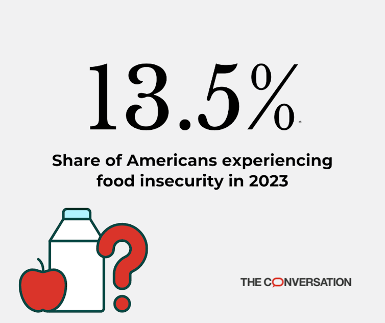 The official U.S. food insecurity rate rose to 13.5% in 2023 from 12.8% in 2022, according to data the U.S. Department of Agriculture released on Sept. 4, 2024. That means more than 1 in 8 Americans – about 47 million people – couldn’t get enough food for themselves or their families at least some of the time.