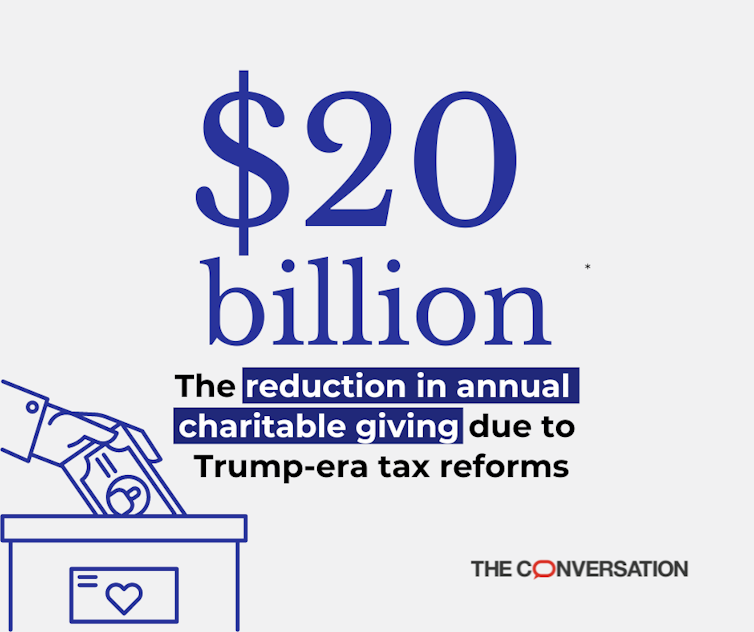 We found that Americans who stopped itemizing their tax deductions gave less to charity in 2018 than they otherwise would have. On average, these donors who could use the charitable deduction in 2016 gave nearly US$1,000 less in 2018 after losing out on the tax break.
