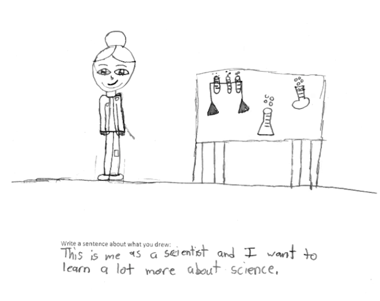 We wanted to get a sense of whether the program increases the kids’ interest in science, as well as whether it changes how they view scientists. To do so, we used an evaluation tool based on the Draw-A-Scientist-Test created by educational researcher David Wade Chambers in 1983 which assessed kids’ preconceived notions of what scientists look like. Researchers later developed a checklist for the drawings that includes certain characteristics like gender, age, race and being in a laboratory.