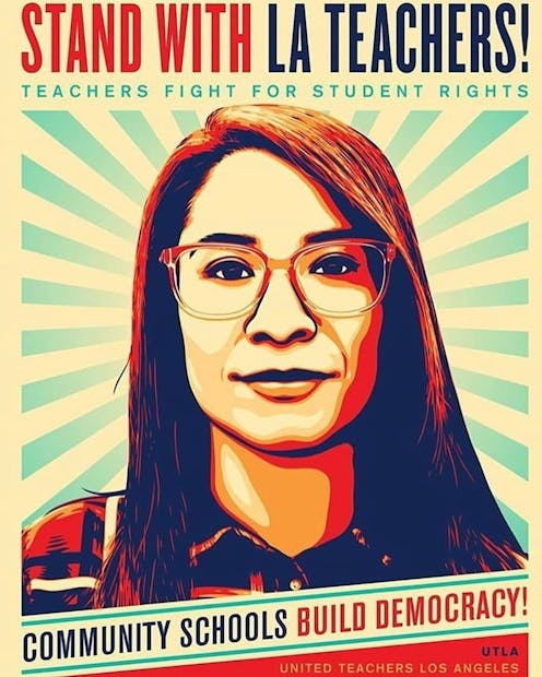 Dueñas teaches history at Roosevelt High School in East Los Angeles. It was her image that was used on a strike poster that served as teachers’ call to arms: “Community Schools Build Democracy!”