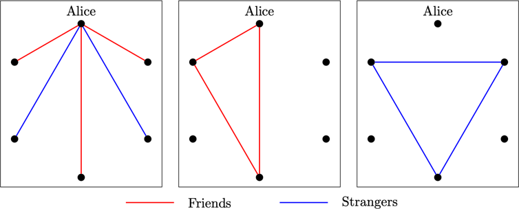 Let’s return to the problem of finding a clique or anti-clique. Consider a girl called Alice who is spending time with five people. Among these five, Alice must see either more friends or more strangers.
