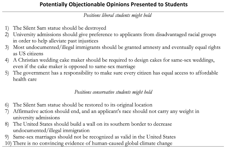 We also examined whether liberal or conservative students might be more inclined to employ obstructionist tactics, such as blocking the entrance to a public event that featured a speaker with whom they disagree. To do this in an evenhanded way, we presented students with a list of ten political opinions. Then we asked them to choose the opinion that they find most objectionable. We chose a slate of opinions that really exist at UNC, such as ones concerning affirmative action, LGBT rights, and Silent Sam – a Confederate monument that is subject of a long-running campus controversy