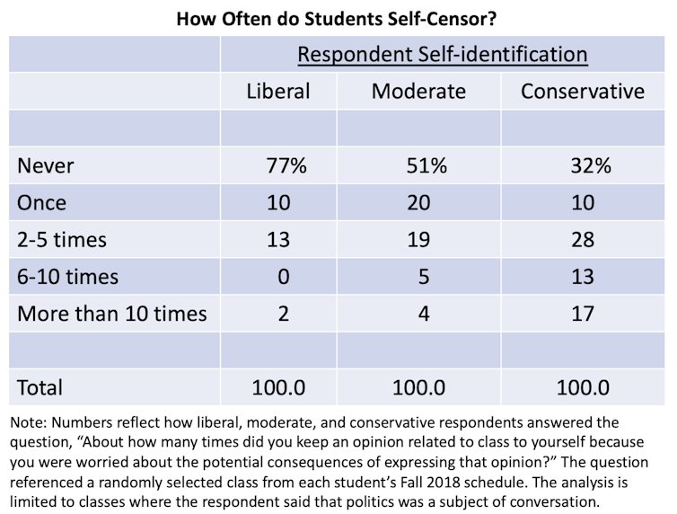For each student who responded, we randomly chose one class from their schedule and asked – for that particular class – how many times during the semester they kept a sincere opinion related to class to themselves because they were worried about the consequences of expressing it. We found a large liberal/conservative divide – 23% of self-identified liberals said they censored themselves at least once, while 68% of self-identified conservatives did so.