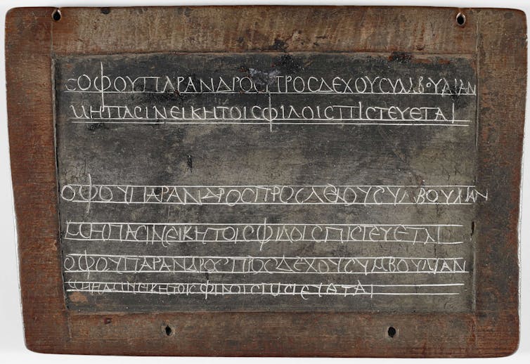Wood tablets covered in beeswax became a popular writing material in Greece, Rome and Egypt. Children used them in school as you might use notebooks today. Heating the wax made it easy to erase the writing and reuse the tablets.