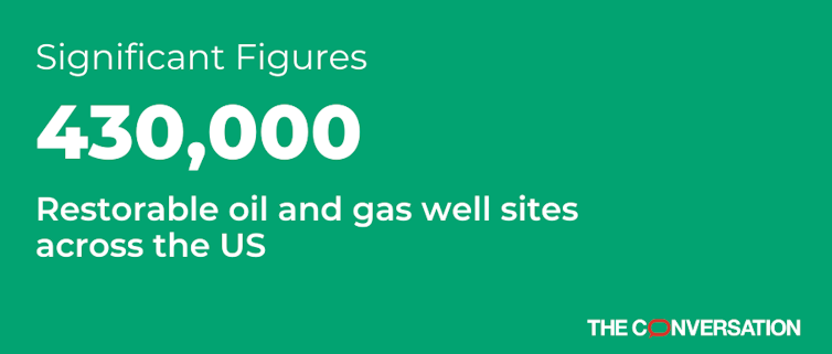 In a recent study, my colleagues and I sought to account for every oil and gas well site in the lower 48 states that was eligible for restoration – meaning that the well no longer was producing oil or gas, and there were no other active wells using that site. We found more than 430,000 old well sites, with associated infrastructure such as access roads, storage areas and fluid tanks. They covered more than 2 million acres – an area larger than Delaware and Rhode Island combined.