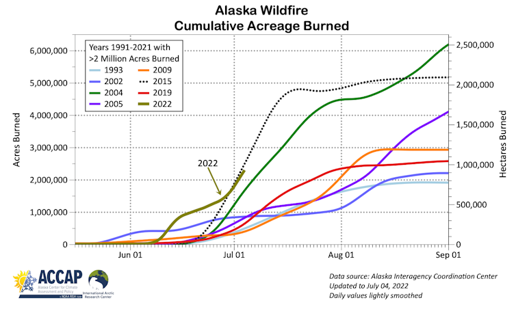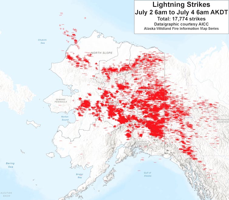 So, the weather factors – the warm spring, low snowpack and unusual thunderstorm activity – combined with multidecade warming that has allowed vegetation to grow in southwest Alaska, together fuel an active fire season.