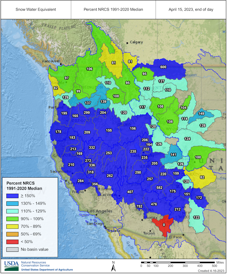 Flooding is certainly a possibility. The closest year for comparison in terms of the amount of snow would be 1983, when the average statewide snow water content was 60.3 inches in May. That was a rough year, with flooding and mudslides in several parts of the West and extensive crop damage.