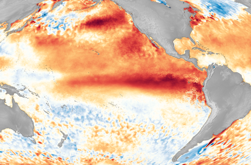 El Niño is a climate pattern that starts with warm water building up in the tropical Pacific west of South America. This happens every three to seven years or so. It might last a few months or a couple of years.
