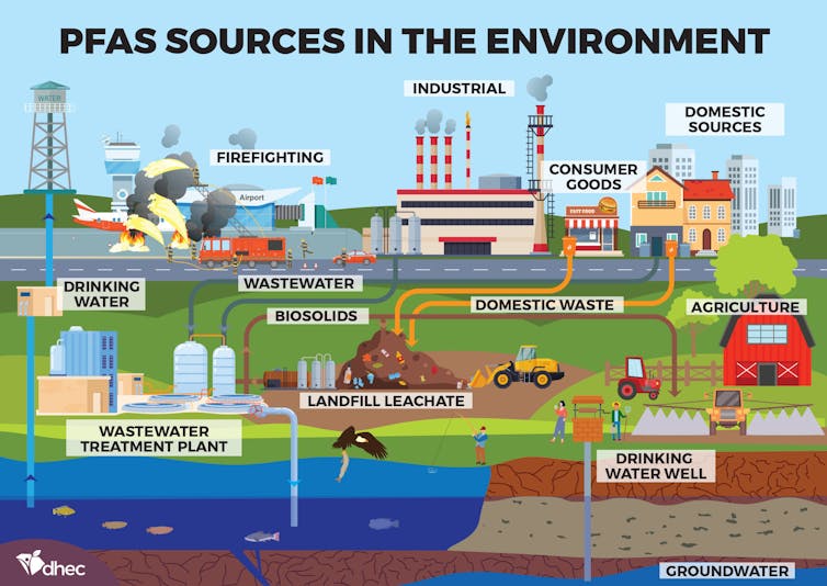 PFAS – perfluoroalkyl and polyfluoroalkyl substances – are a group of human-made contaminants that have been used for over 50 years. They’re found in personal care products, such as cosmetics and shampoo, and in water-repellent coatings for nonstick cookware and food packaging. They’re also used in adhesives and aqueous firefighting foams, among other products.
