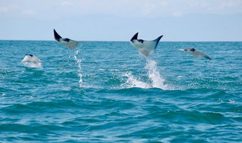 However, basking sharks – enormous, slow-swimming sharks that feed by filtering tiny plankton from seawater – also breach. So do many ray species, such as manta rays, which also are primarily filter feeders. This suggests that breaching likely serves different functions among different types of sharks and rays.
