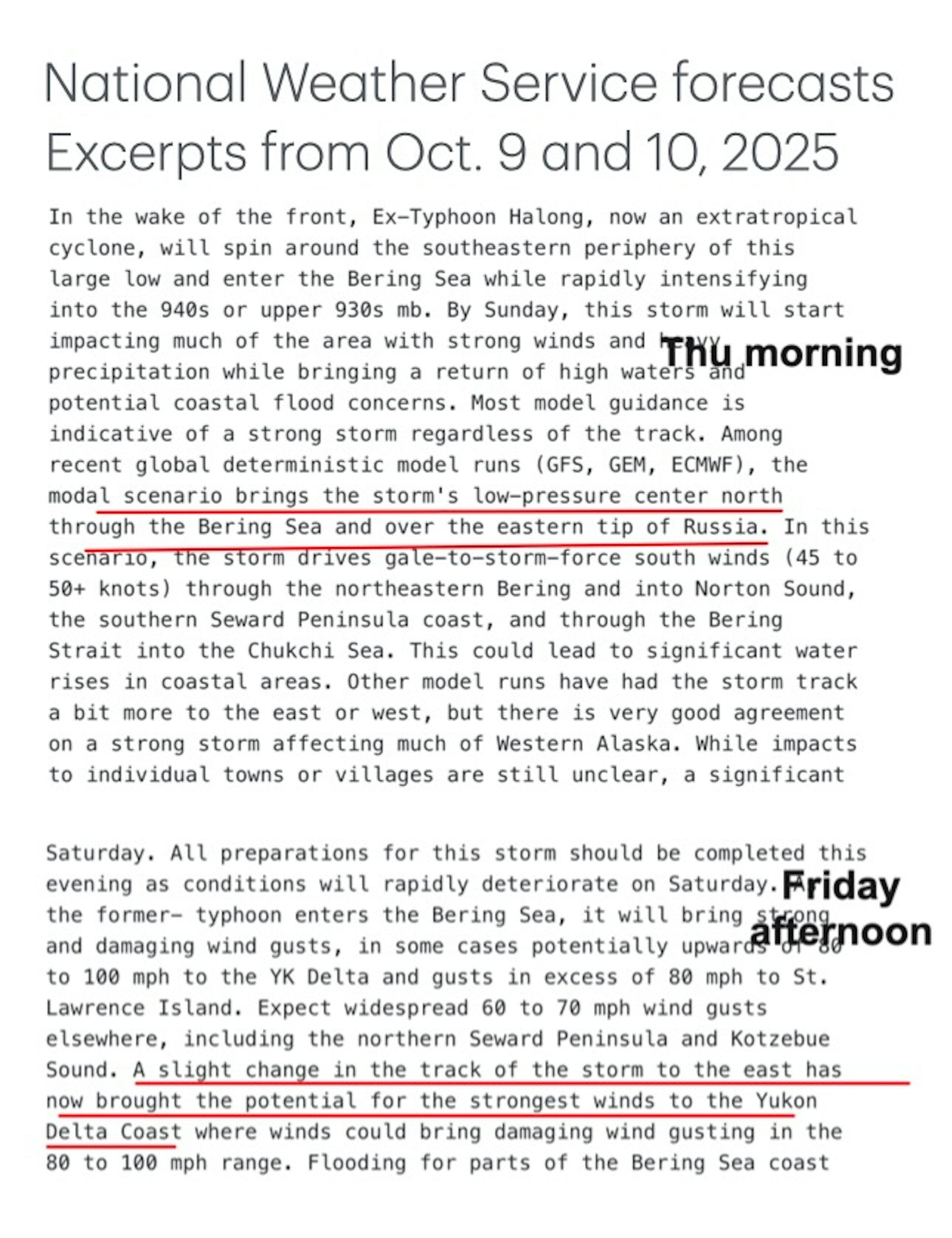 Unlike Merbok, which was very well forecast by the global models, this one’s final track and intensity weren’t clear until the storm was within 36 hours of crossing into Alaska waters. That’s too late for evacuations in many places.