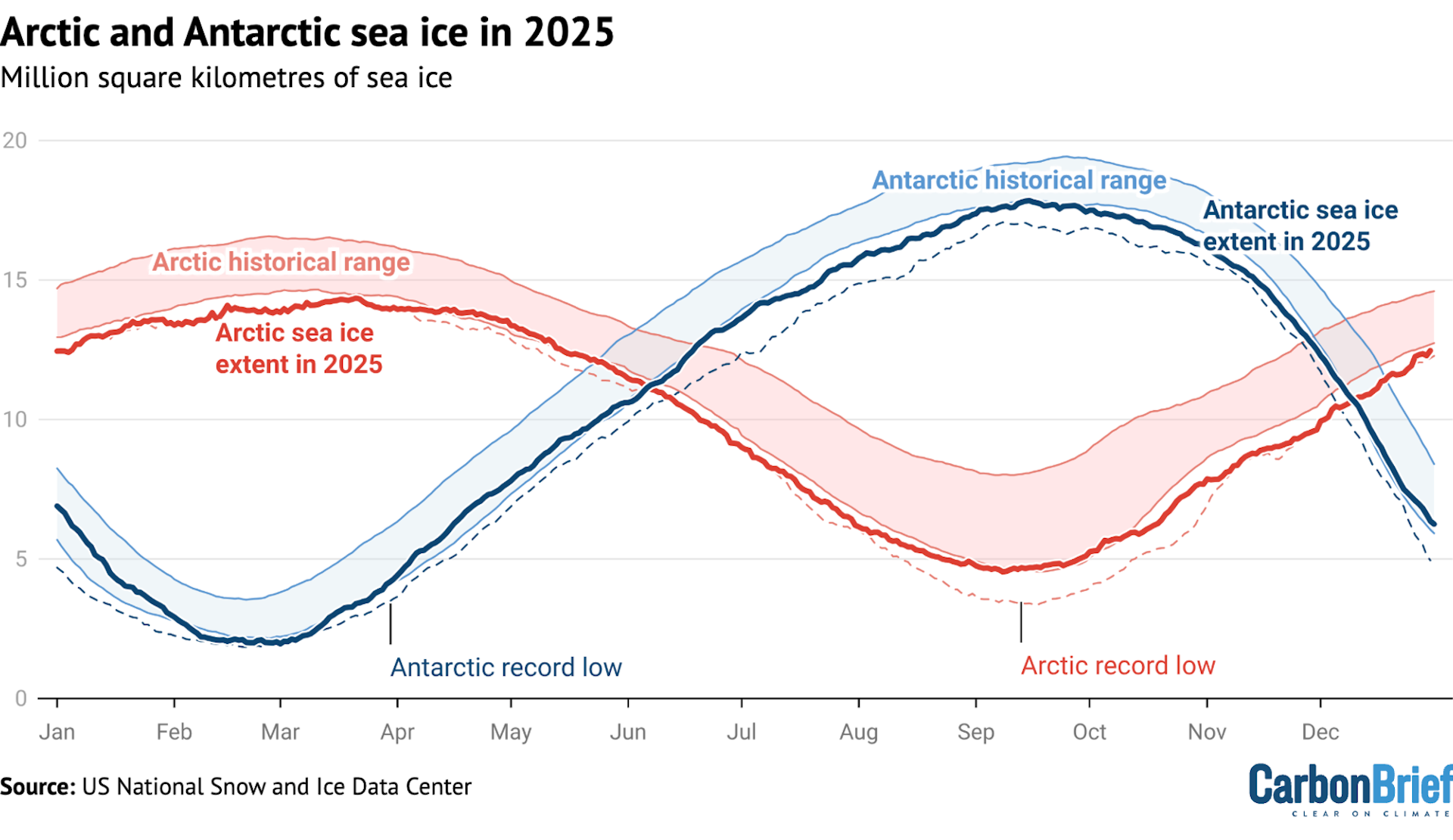 Declining polar ice, which efficiently reflects sunlight back into space, also affects the energy balance. As sea ice declines, it leaves dark ocean water that absorbs most of the sunlight that reaches it. In a spiraling feedback, warmer water melts sea ice, allowing more sunlight into the ocean, warming it faster; 2025 had the lowest winter peak of Arctic sea ice on record and the third-lowest minimum extent of Antarctic ice.
