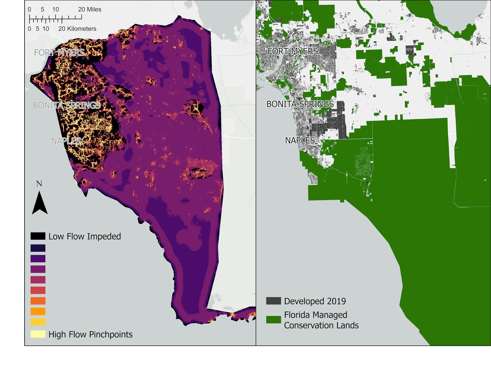 In the broader southwestern Florida region, those bottlenecks show up near urbanizing areas such as Naples, Fort Myers and Bonita Springs. In Fort Myers, for example, squirrel movement was funneled into just a few narrow routes, such as urban parks in highly developed areas and less developed spaces such as golf courses and residential neighborhoods with tree cover. Movement was more diffuse near wetlands and along the Caloosahatchee River.