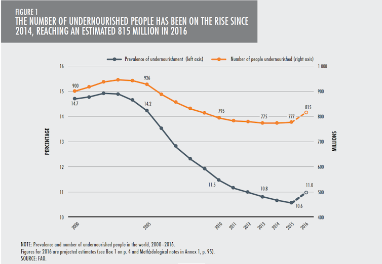 Around the globe, about 815 million people – 11 percent of the world’s population – went hungry in 2016, according to the latest data from the United Nations. This was the first increase in more than 15 years.