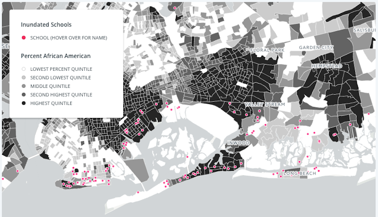Latino communities, though slightly underrepresented in the most damaged areas, joined African-American counterparts in watching many of their local schools undergo flooding. As our geographic analysis demonstrated, the inundation of schools proved widespread along the south shore from central Nassau westward through Queens and Brooklyn.