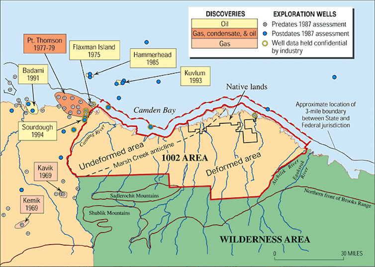 Though only one well has ever been drilled in the 1002 Area, dozens have been sited in surrounding onshore and offshore areas. These have resulted in a number of limited discoveries and one substantial field, Point Thomson, which is estimated to have recoverable reserves of up to 6 trillion cubic feet of gas and 850 million barrels of oil plus condensate. It began producing in 2016, yet its reservoir is geologically complex, challenging and insufficiently understood, causing difficulties and raising costs.