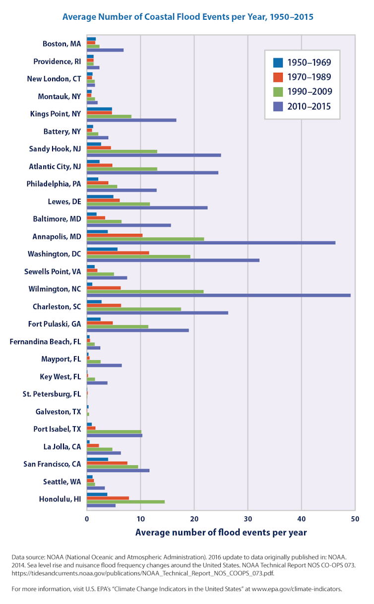 Now we are looking at data from the Gulf of Mexico, where tide stations are also showing water levels which are typically higher than predicted. The increase along Florida’s Gulf coast is past its peak, but Texas and Louisiana are still seeing an acceleration in sea level rise. Accelerations in sea level rise are hard to predict, and it is unclear whether they will become more serious over time. But they make it even more urgent for coastal communities to take sea level rise seriously today.