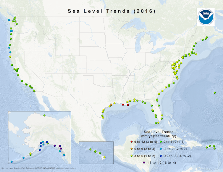 In a study we co-authored with our colleague Jon Martin, we showed that two converging natural climate processes created a “hot spot” from Cape Hatteras, North Carolina to Miami where sea levels rose six times faster than the global average between 2011 and 2015. We also showed that such hot spots have occurred at other points along the Eastern Seaboard over the past century. Now we see indications that one is developing in Texas and Louisiana, where it likely amplified flooding during Harvey – and could make future coastal storms more damaging.