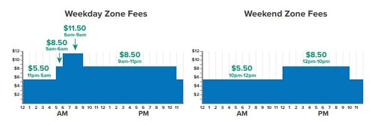 While the United States has over 5,000 miles of toll roads, congestion pricing is uncommon. One exception is Interstate Route 66 in the Washington, D.C., metro region, where fluctuating tolls were introduced on Dec. 4, 2017. Pricing for these express lanes changes every six minutes during rush hour eastbound in the morning and westbound in the afternoon. The toll hit $40 for a 10-mile stretch the day after it was introduced.