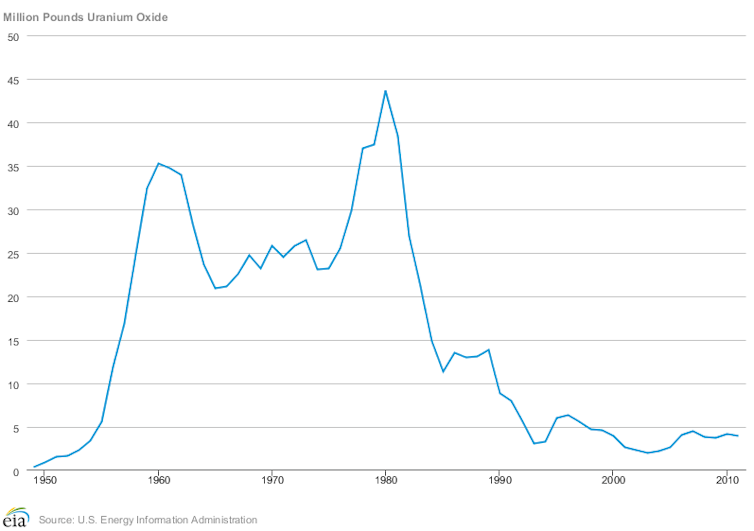The first U.S. uranium boom occurred during the early Cold War and ended in the 1960s due to oversupply, triggering a bust. A second boom began later in the decade when the federal government authorized private commercial investment in nuclear power. But the Three Mile Island (1979) and Chernobyl (1985) disasters ended this second boom.