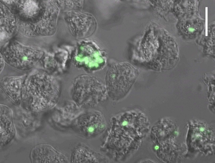 The next step was to determine how plague bacteria interacted with the various amoeba species we identified. In a special high-containment laboratory, designed to prevent dangerous pathogens from accidentally escaping, we combined amoebae and various strains of plague bacteria obtained from the U.S. Centers for Disease Control’s laboratory in Fort Collins, Colorado. We used a genetically altered strain of plague that fluoresces neon green to determine if and when amoebae were ingesting plague bacteria by viewing them under a high- powered microscope.