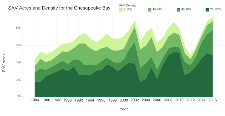 In a new study, we provide conclusive evidence that reducing discharges of nitrogen, phosphorus and other pollutants into the bay has produced the largest resurgence of underwater grasses ever recorded anywhere. This success shows that coastal ecosystems are resilient and that concerted efforts to reduce nutrient pollution can result in substantial improvements.