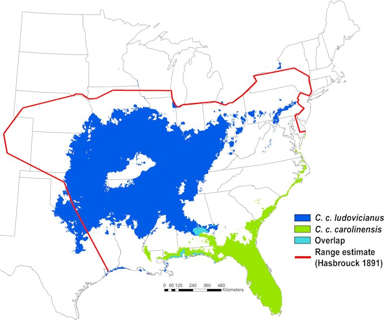 Thanks to the data I compiled as well as cutting-edge machine learning approaches to analyze those data, my colleagues and I were able to reconstruct the Carolina parakeets’ likely range and climate niche. It turned out to be much smaller than previously believed. Generally, their range extended from Nebraska east to Ohio, south to Louisiana and Texas. The eastern subspecies lived mostly along the southeastern coast from Alabama, through Florida and up to Virginia.
