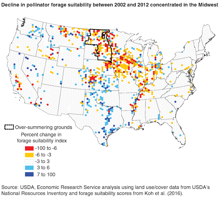 Reasons for bumble bee decline include increased prevalence of pests and pathogens, poor nutrition and pesticide exposure. Many of these stressors are due to agricultural intensification, particularly in the Midwest. Traditionally, grassland prairies provided nutritionally dense, safe forage for bees. But most former prairie lands have been converted to corn and soybean fields or developed for commercial and residential use. As a result, bumble bees are increasingly exposed to pesticides and their food supply is shrinking.