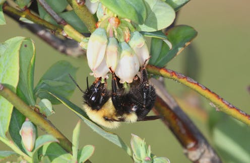 Along with honey bees, wild bees are also vital for crop pollination. Research has shown that the presence of wild bees increases yields across many types of crops. They often are more efficient at pollinating crops native to North America than honey bees. For example, a honey bee would have to visit a blueberry flower four times to deposit the same amount of pollen as a single visit from a bumble bee queen.
