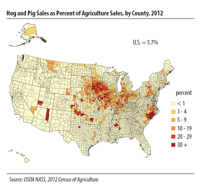 Iowa and North Carolina are the largest pork-producing states in the nation. Hog farms generated US$6.8 billion in sales in Iowa in 2012 and $2.9 billion in North Carolina.