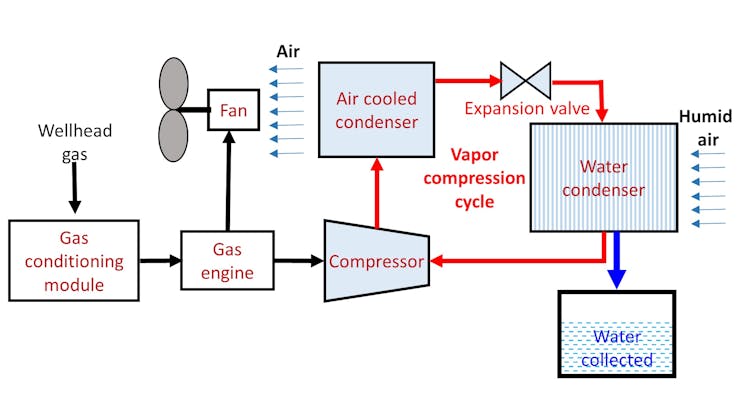 Here’s how the process would work. Excess gas, that would otherwise go to waste, could power an engine of a big refrigeration unit. This industrial-scale refrigerator would swallow lots of humid air, condensing this moisture into water much like how the air conditioning systems operate in office and residential buildings.