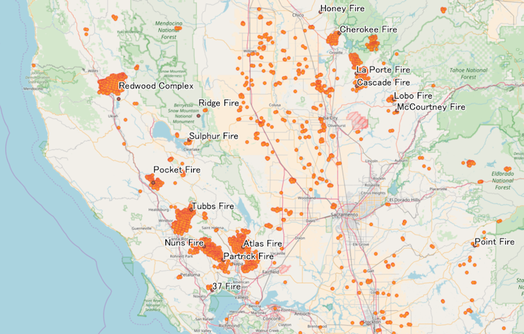 California’s drought has also killed more than 100 million trees, which can stoke more intense fire behavior. Dead needles on coniferous trees killed by drought can act like fine fuels, spreading fire rapidly through the crowns of the dead trees and igniting heavy timber below them.