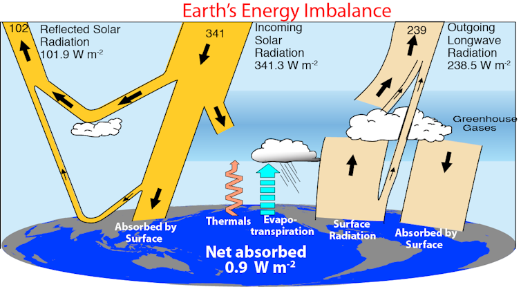 Heat-trapping gases in the atmosphere act as a blanket and inhibit the infrared radiation – that is, heat from the Earth – from escaping back into space to offset the continual radiation coming from the sun. As these gases build up, more of this energy, mostly in the form of heat, remains in our atmosphere. The energy raises the temperature of the land, oceans and atmosphere, melts ice, thaws permafrost, and fuels the water cycle through evaporation.