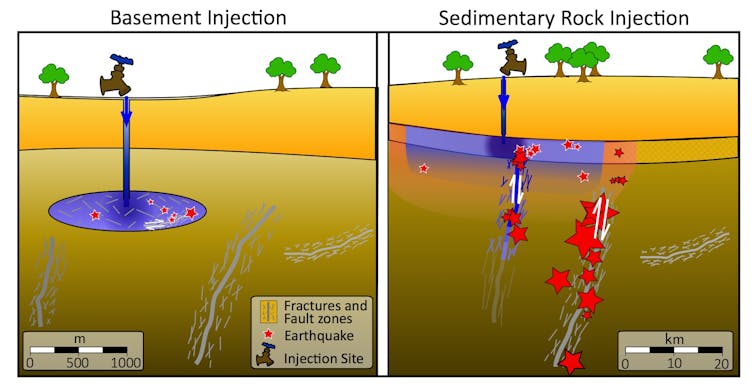 We found that these sites fell into two categories, depending on the injection strategy used. For context, oil and gas deposits form in basins. As layers of sediments gradually accumulate, any organic materials trapped in these layers are compressed, heated and eventually converted into fossil fuels. Energy companies may inject wastewater either into the sedimentary rocks that fill oil and gas basins, or into older, harder underlying basement rock.