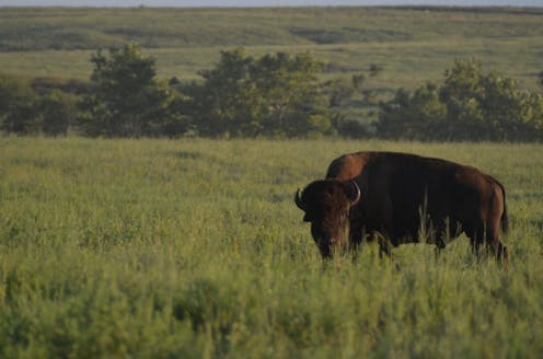 Studies, including my own research, have shown that bison-induced changes in vegetation composition and quality grazing can increase the abundance and diversity of birds and insects in tallgrass prairies. Bison also affect their environment by wallowing – rolling on the ground repeatedly to avoid biting insects and shed loose fur. This creates long-lasting depressions that further enhance plant and insect diversity, because they are good habitats for plant and animal species that are not found in open areas of the prairie. In contrast, cattle do not wallow, so they do not provide these benefits.