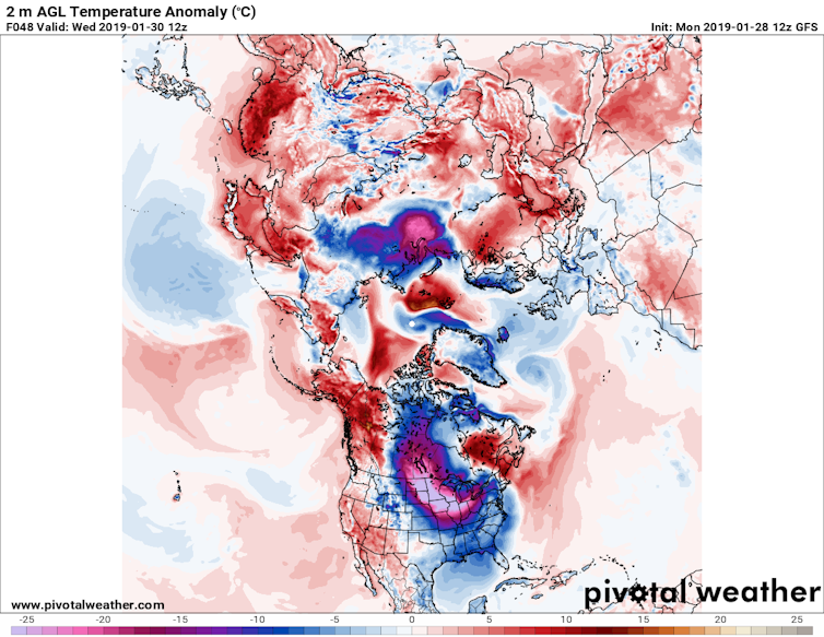 A record-breaking cold wave is sending literal shivers down the spines of millions of Americans. Temperatures across the upper Midwest are forecast to fall an astonishing 50 degrees Fahrenheit (28 degrees Celsius) below normal this week – as low as 35 degrees below zero. Pile a gusty wind on top, and the air will feel like -60 F.
