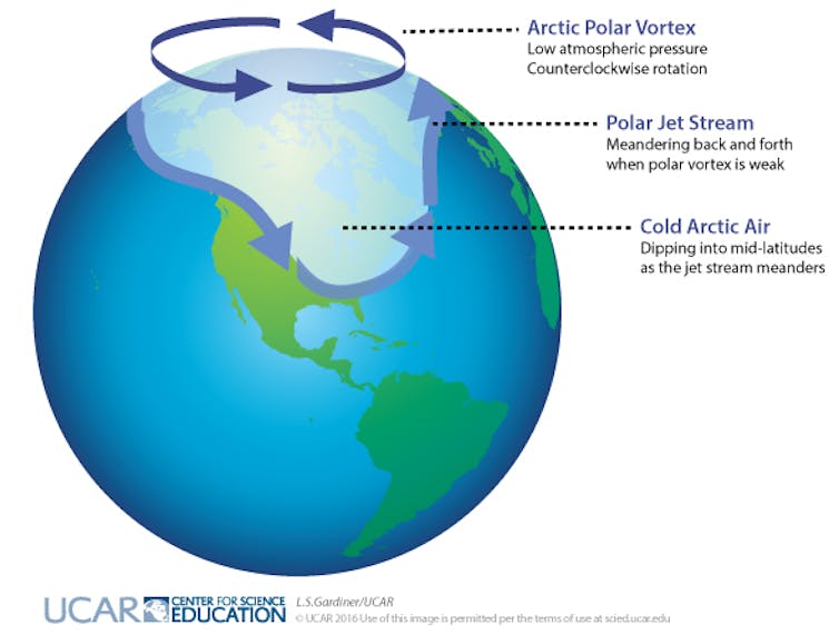 Life-threatening cold temperatures in the central US are caused by changes in wind circulation in the Arctic that bring cold air south. Climate change could make these events more frequent.
