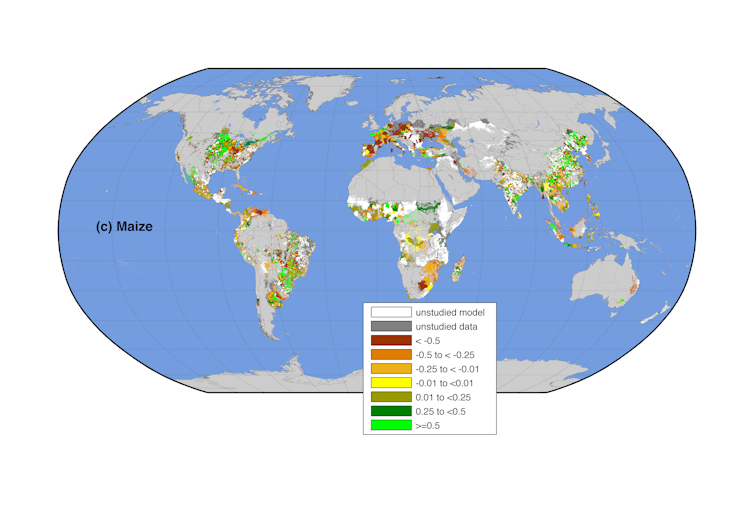 We found that climate change has affected yields in many places. Not all of the changes are negative: Some crop yields have increased in some locations. Overall, however, climate change is reducing global production of staples such as rice and wheat. And when we translated crop yields into consumable calories – the actual food on people’s plates – we found that climate change is already shrinking food supplies, particularly in food-insecure developing countries.