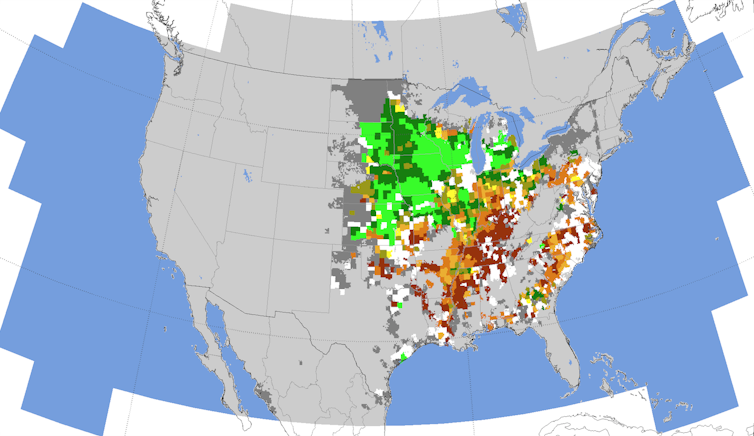 In the United States corn and soybeans are important cash crops, with a combined value of more than US$90 billion in 2017. We found that climate change is causing a small net increase in yields of these crops – on average, about 0.1% and 3.7% respectively each year.